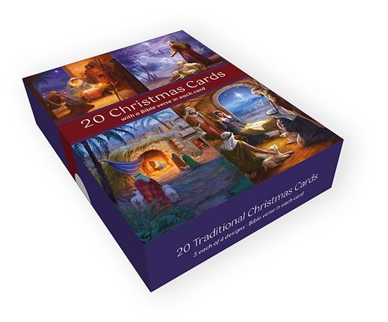 Box of 20 assorted traditional nativity Christmas cards: 5 cards each of 4 designs with white envelopes. Cards measure either 125x125mm or 105x151mm and contains a Bible verse and the greeting God bless you at Christmas.